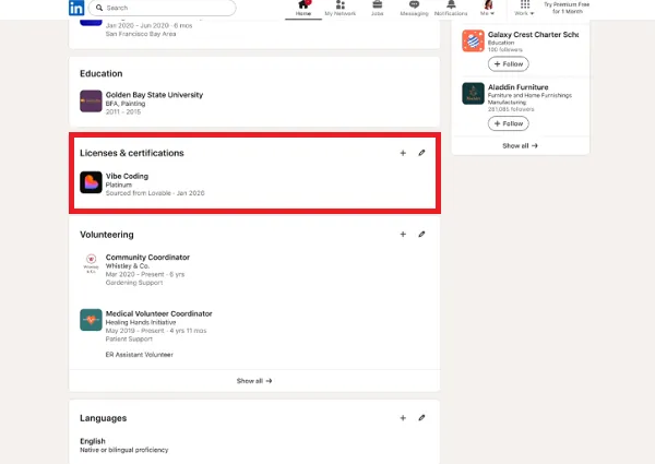 As you may see on this instance, LinkedIn is rolling out a brand new “Vibe Coding” qualification, which will probably be an non-obligatory show within the “Licenses and Certifications” factor of your LinkedIn profile.
